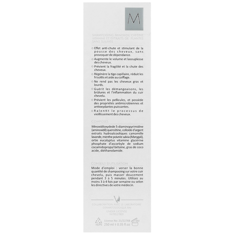 کوکامیدو پروپیل بتائین، کوکونات فتی اسید دی اتانول آمید، کراتین هیدرولیز شده، کافئین، کوئرستین کلرید نقره، عصاره آلوئه ورا و ویتامین B5، ویتامین C، گلیسیرین مونو استئارات، بهنتریمونیوم دی آمینو پریمیدین اکساید ماینوکسیدیل، آب دیونیزه.